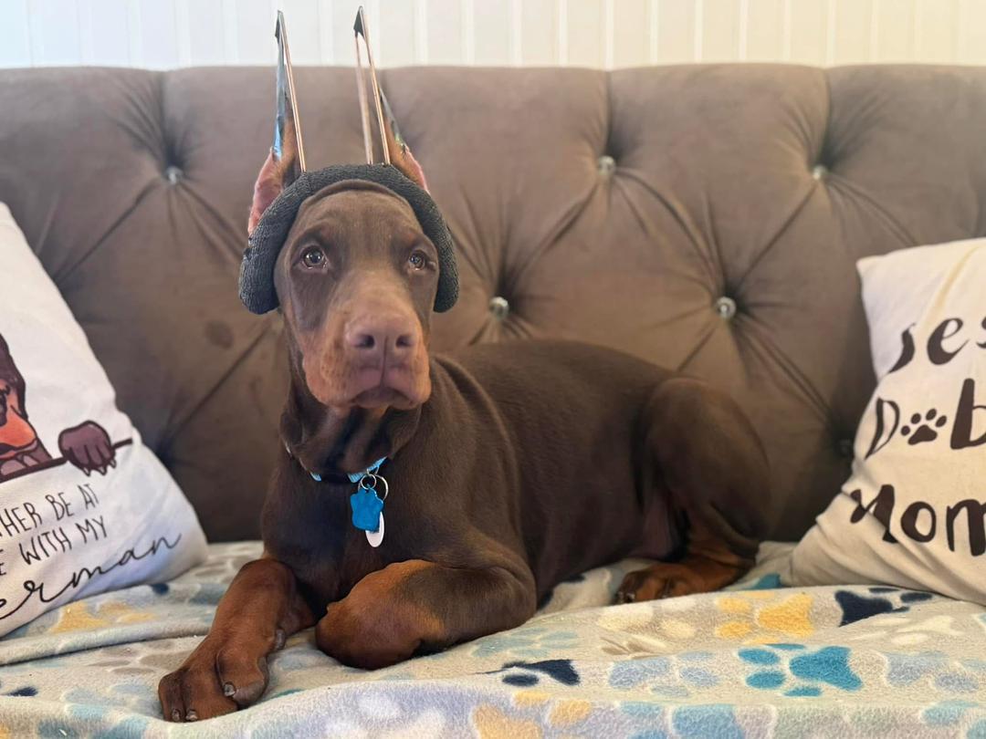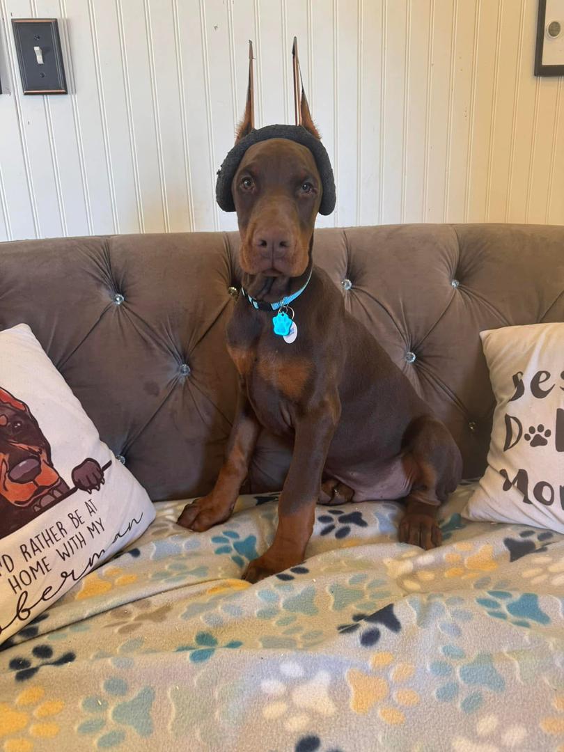 Copper Halo reads his people well and loves being part of the action. He sits nicely for photos, enjoys couch time, and has that “soft” Doberman expression that makes you want to hug him. He’s attentive without being over-the-top, making him a great fit for families or individuals who want both companionship and capability.