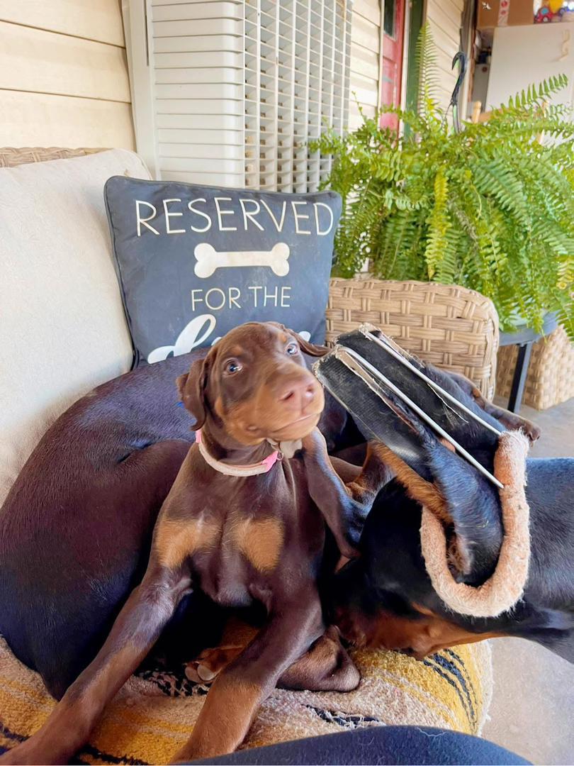 Yes, she’s been around adult Dobermans and learns quickly from calm, confident role models. Slow, supervised introductions are still recommended in her new home.