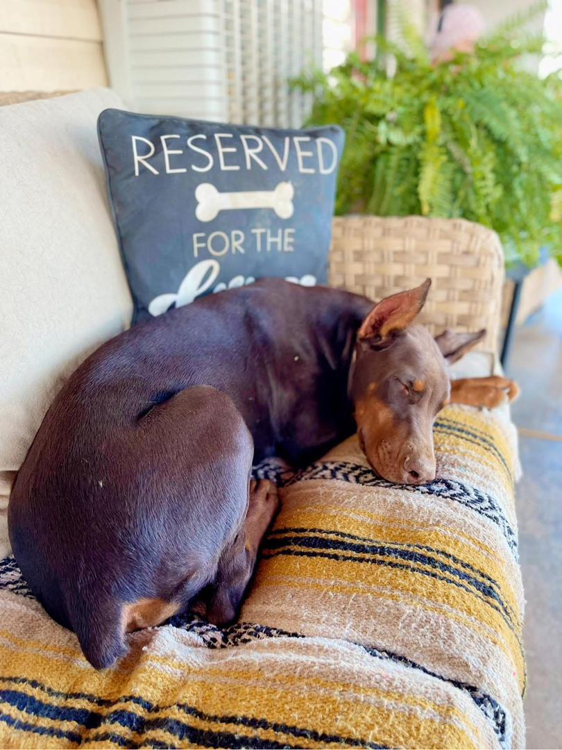 Mocha Velvet loves her people. The photos say it all, cozy on the couch, happy to share space with adult dogs, and relaxed in new environments. She’s observant without being anxious, and she settles beautifully once she’s had her playtime and potty break.
